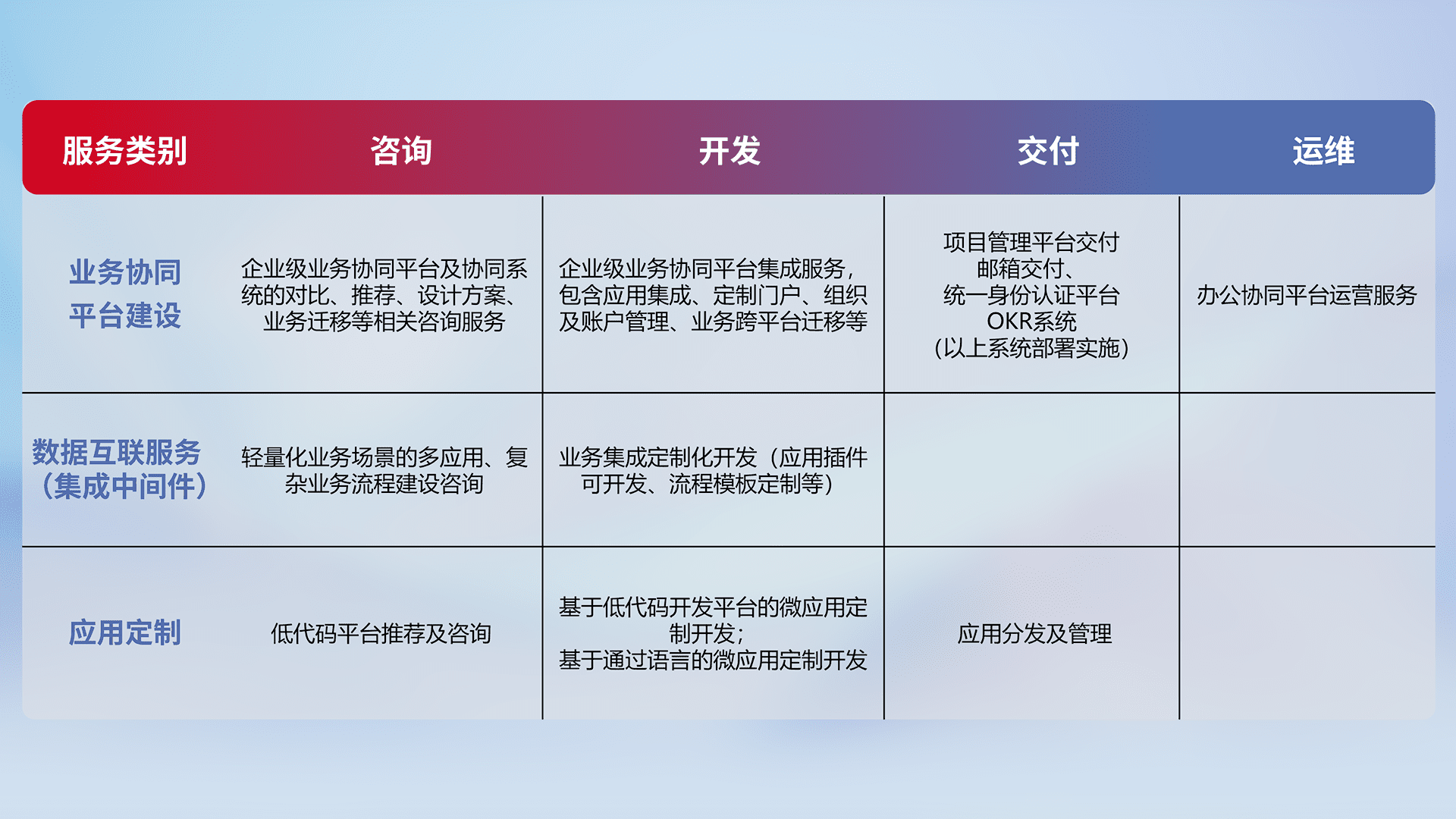 针对钉钉、、企微、、、、IDaas等平台级产品提供产品的规划、、、、方案、、交付、、、定制化开发等服务,,,,实现如统一协同办公、、、智能客户服务、、、混合会议管理、、智能数据查询、、、、等业务场景,,,,实现数字化转型。。。。